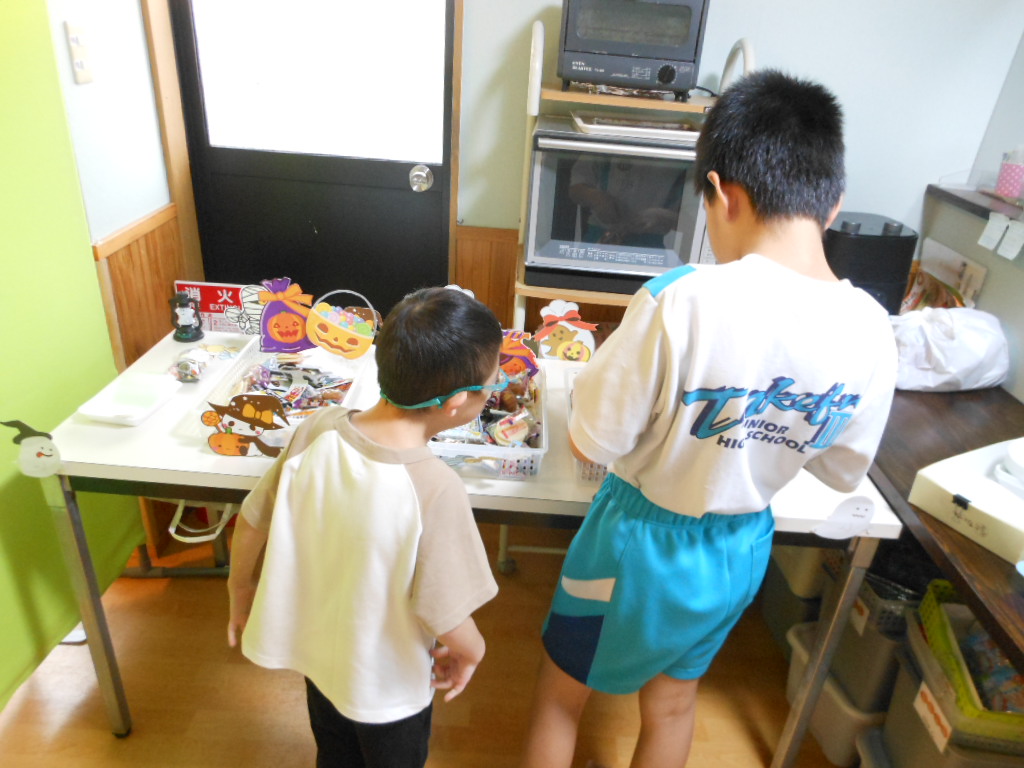 2025.10.28 未分類ichibankaigo ハロウィン👻お菓子詰め こんにちは!児童発達支援・放課後等デイサービス翔っ子です。10月27日~10月31日の期間ハロウィン🎃のお菓子詰めを行います。初日の様子をご紹介します。