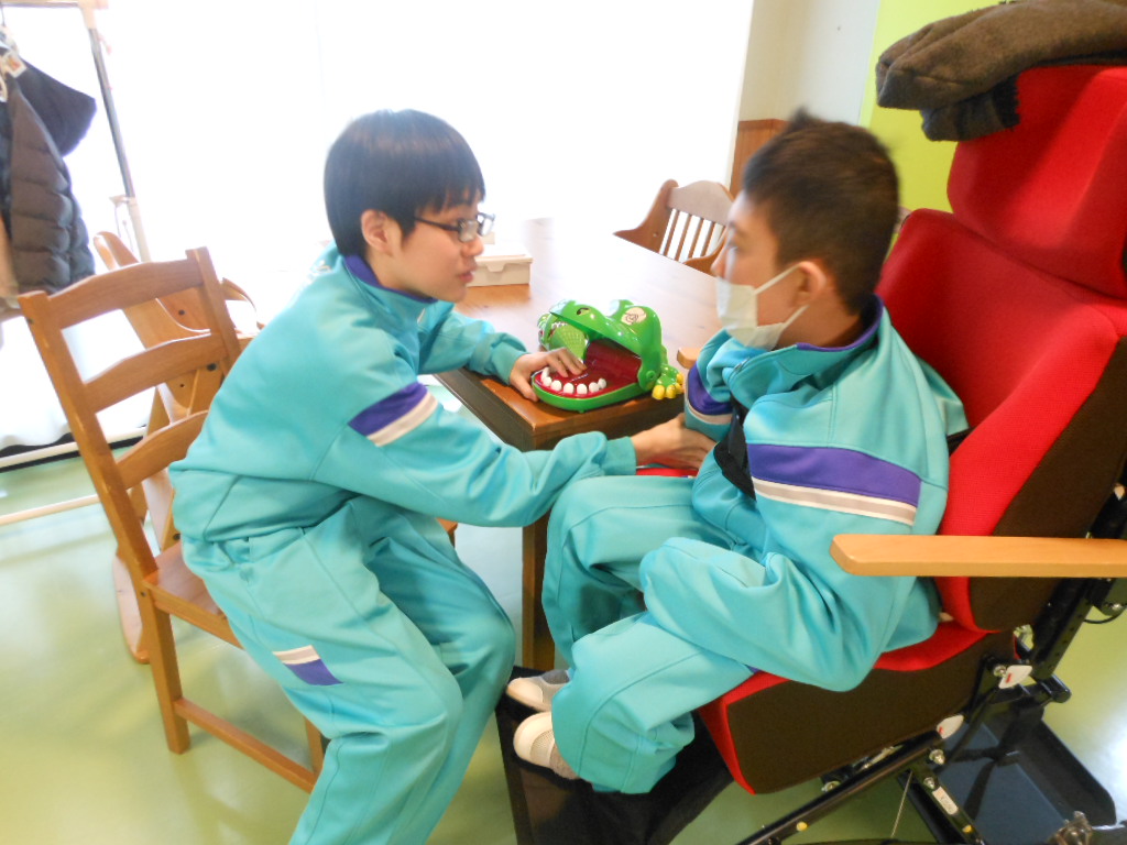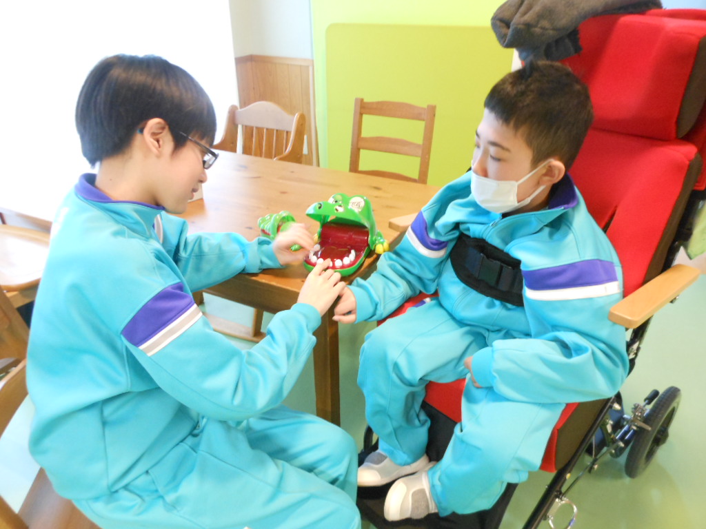 ↑ 大きいワニワニパニックと、小さいワニワニパニックの両方を使って遊んでいるところです。「どこ押したい?」「ここ押して!」と仲良く2人で声掛けしながら遊んでいる姿、なんとも微笑ましくて写真を撮っている職員もほっこりする気持ちになりました。(ブログを書いている職員が一番泣いているのはここだけの話です💦)