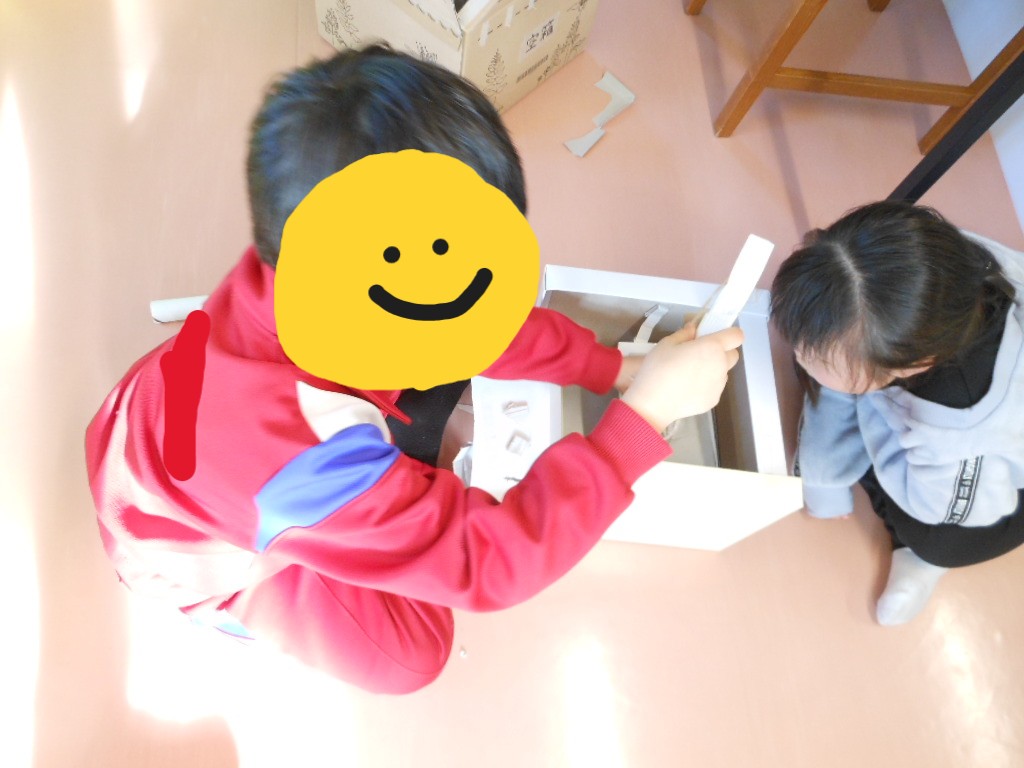 空箱を上手に組み合わせクレーンゲームを作っていました😲